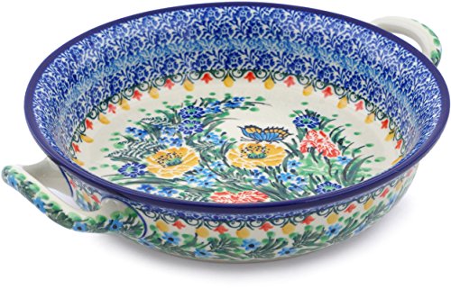 Product Highlight Polish Pottery Medium Round Baker with Handles made by Ceramika Artystyczna (Sipping Nectar Theme) Signature UNIKAT + Certificate of Authenticity